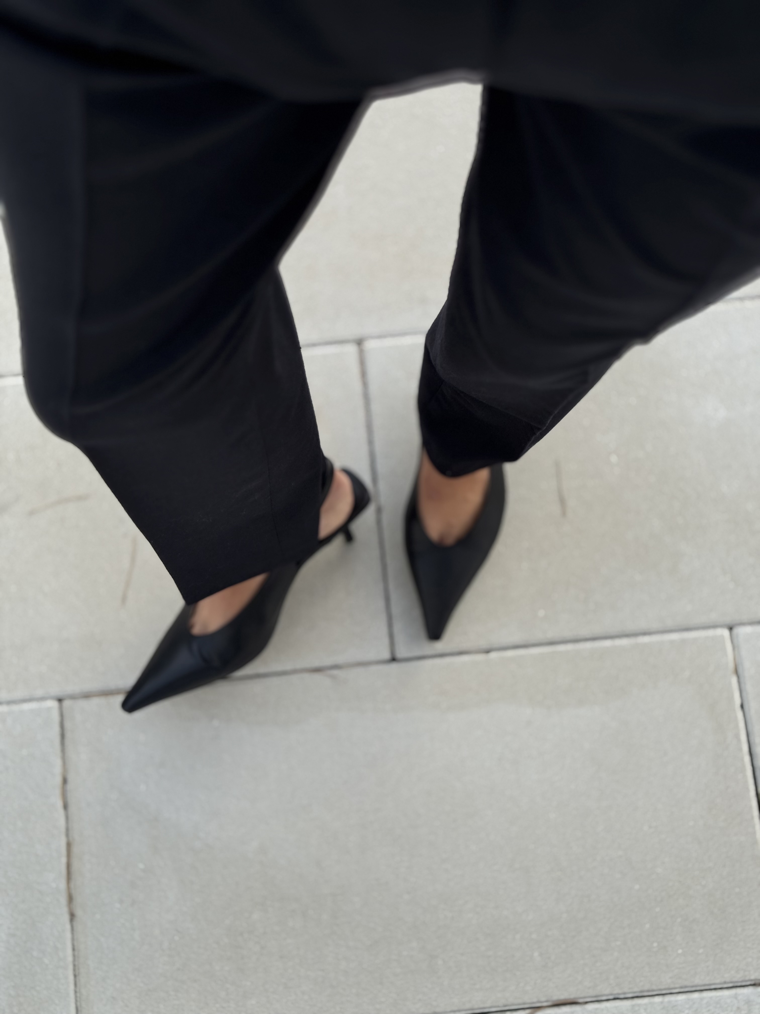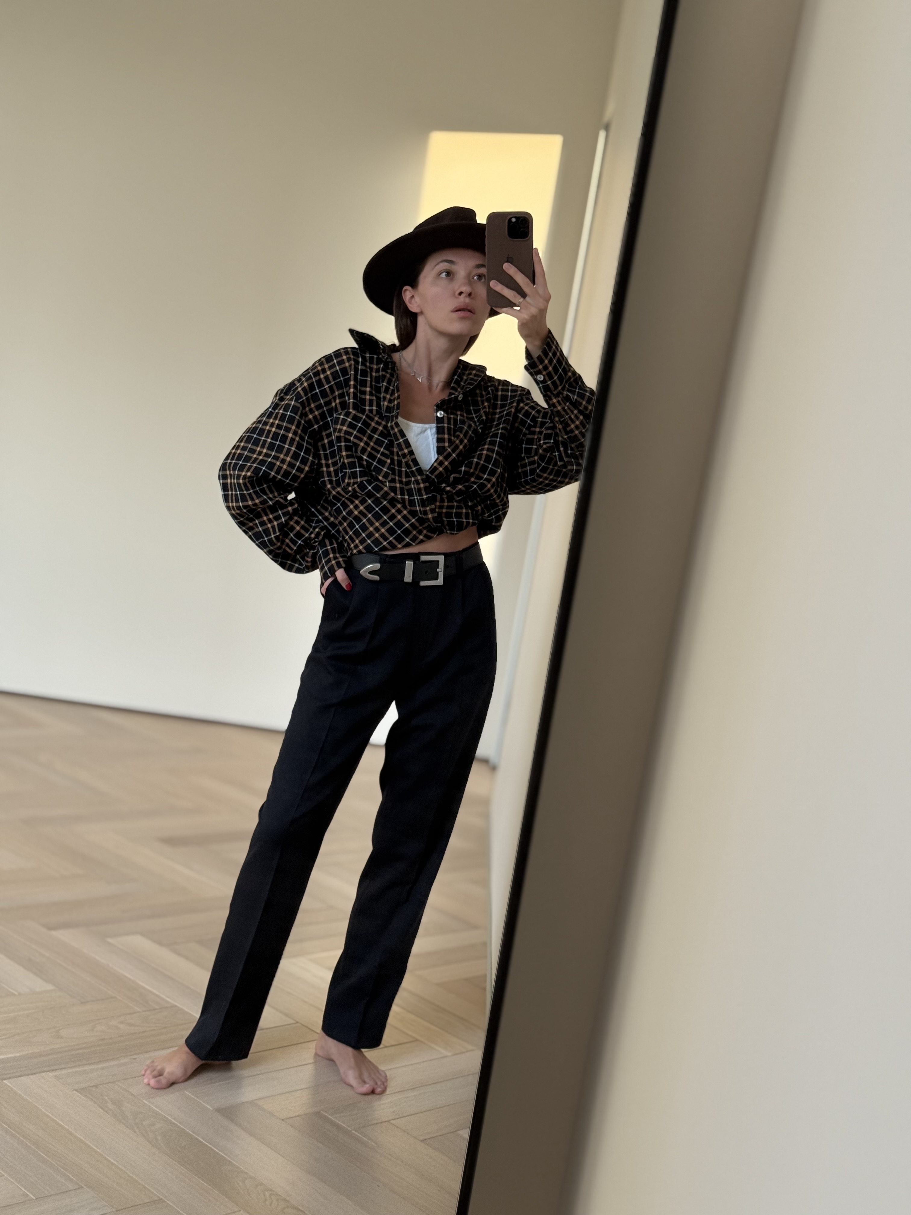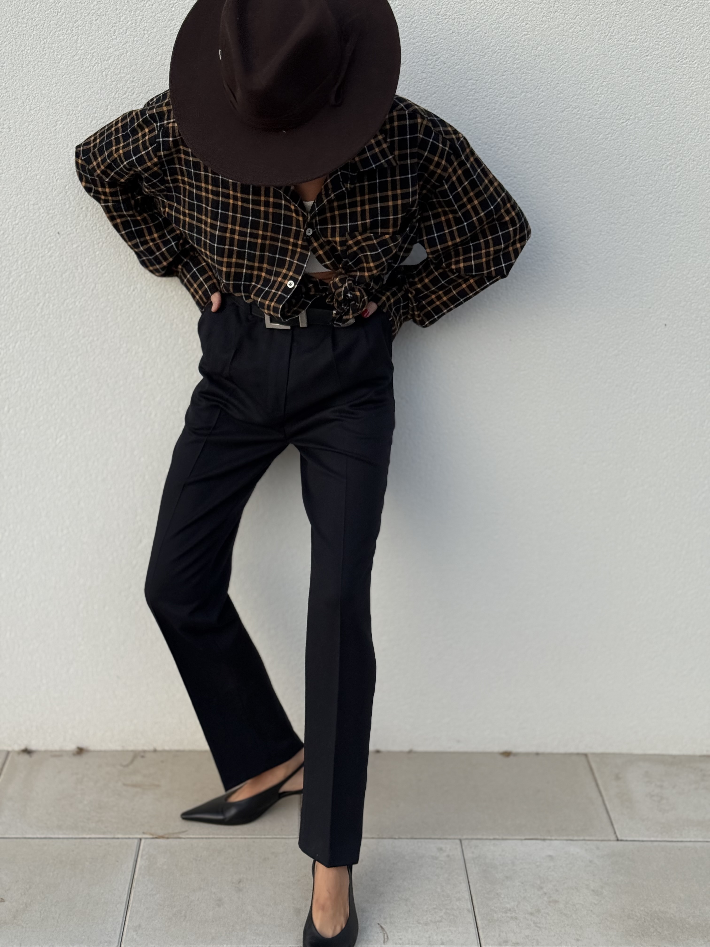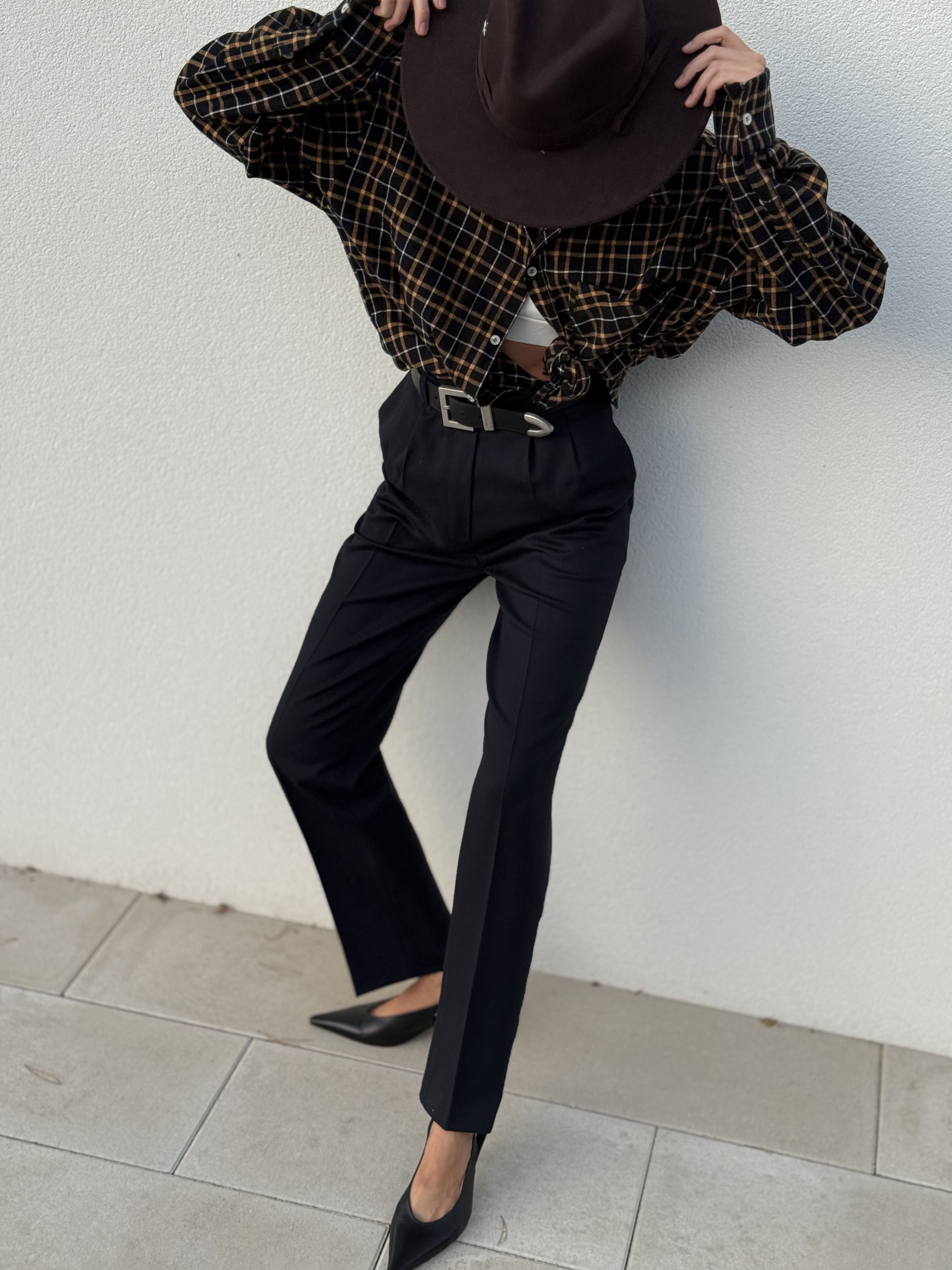 Брюки с высокой посадкой, прямыми узкими штанинами и всеми элементами классических брюк: шлейки для ремня, функциональные карманы, защипы и заданные стрелки |