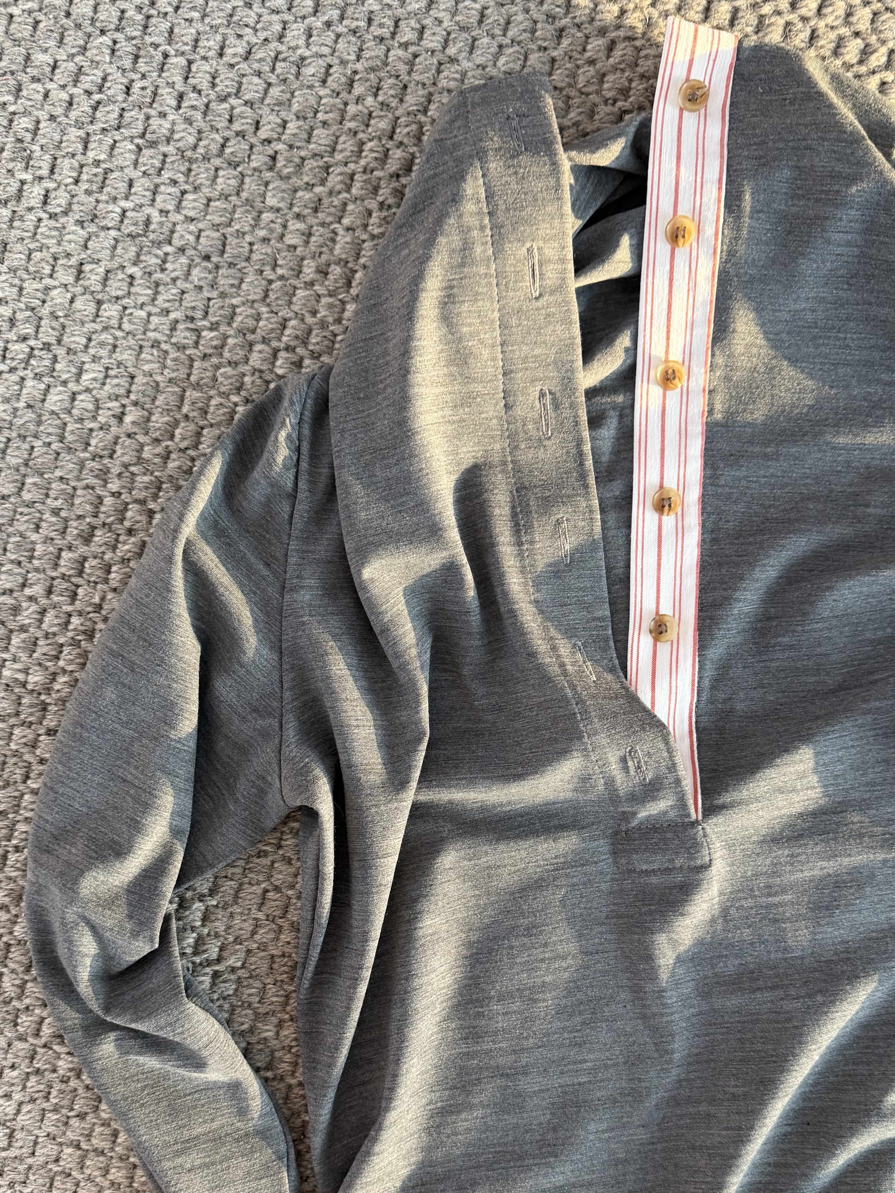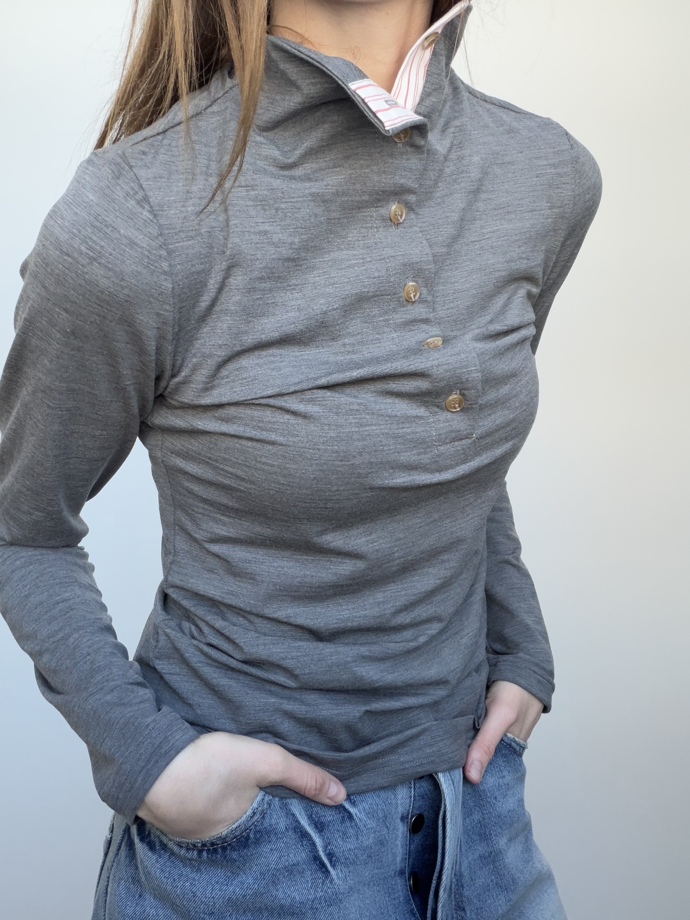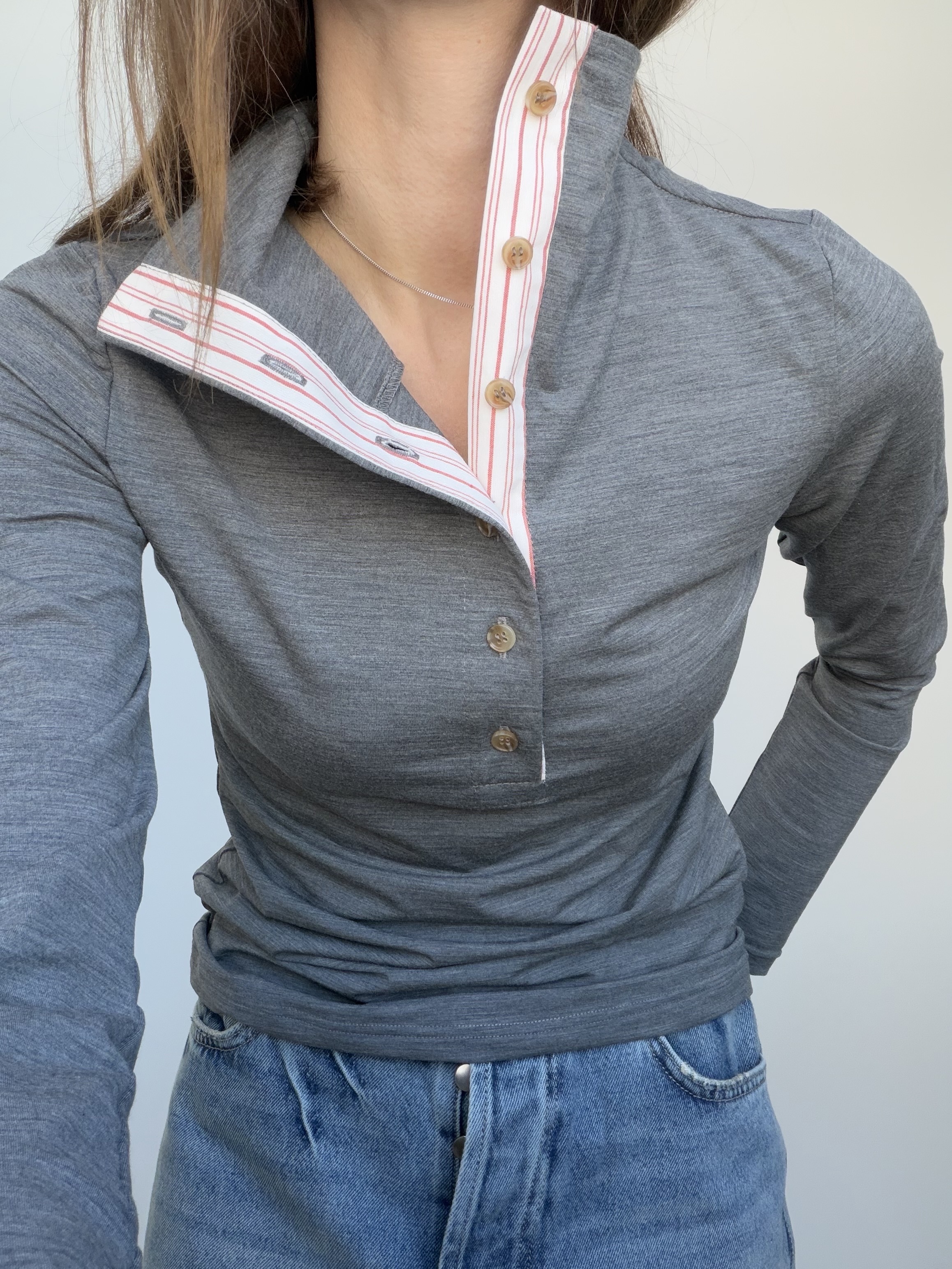 Высокая горловина на пуговичках обработана контрастным хлопком