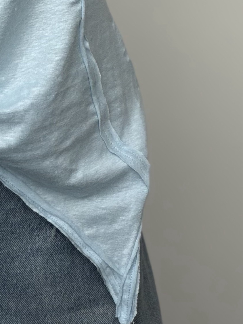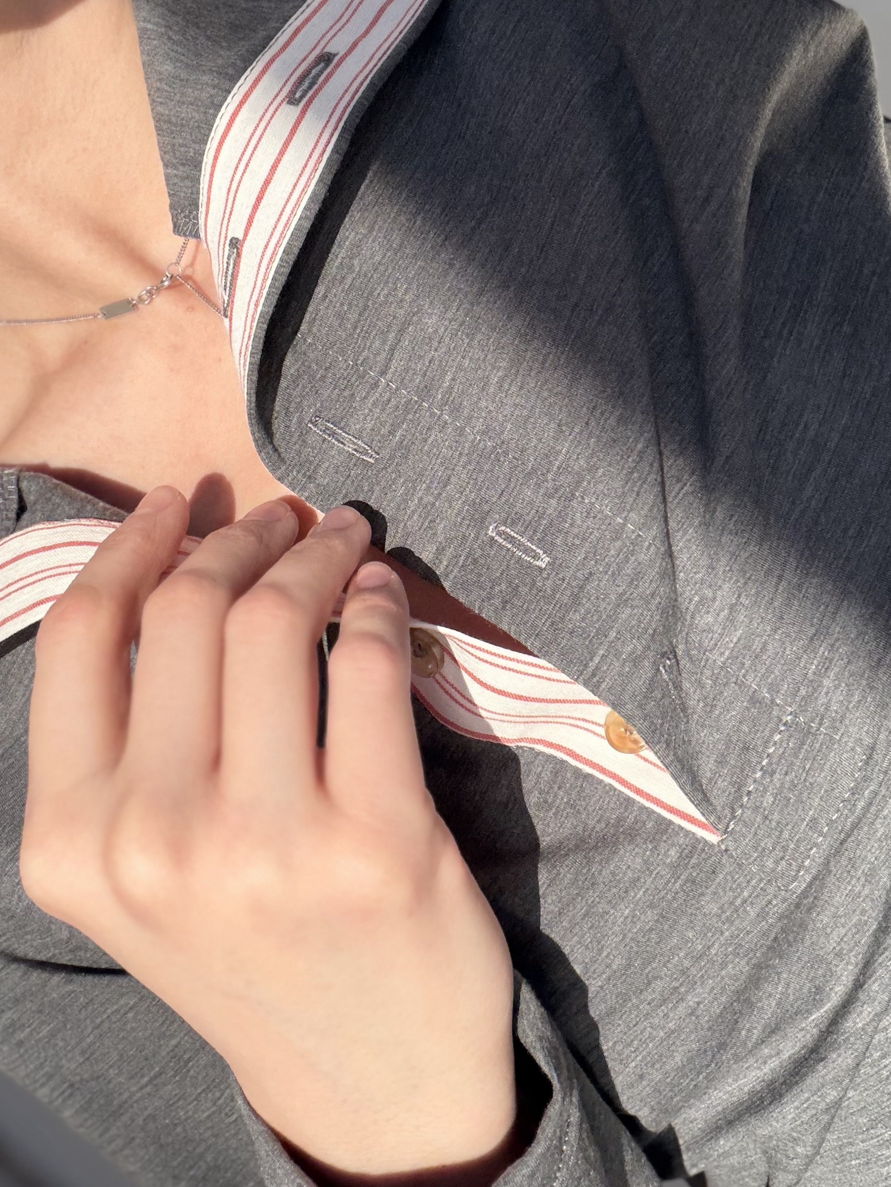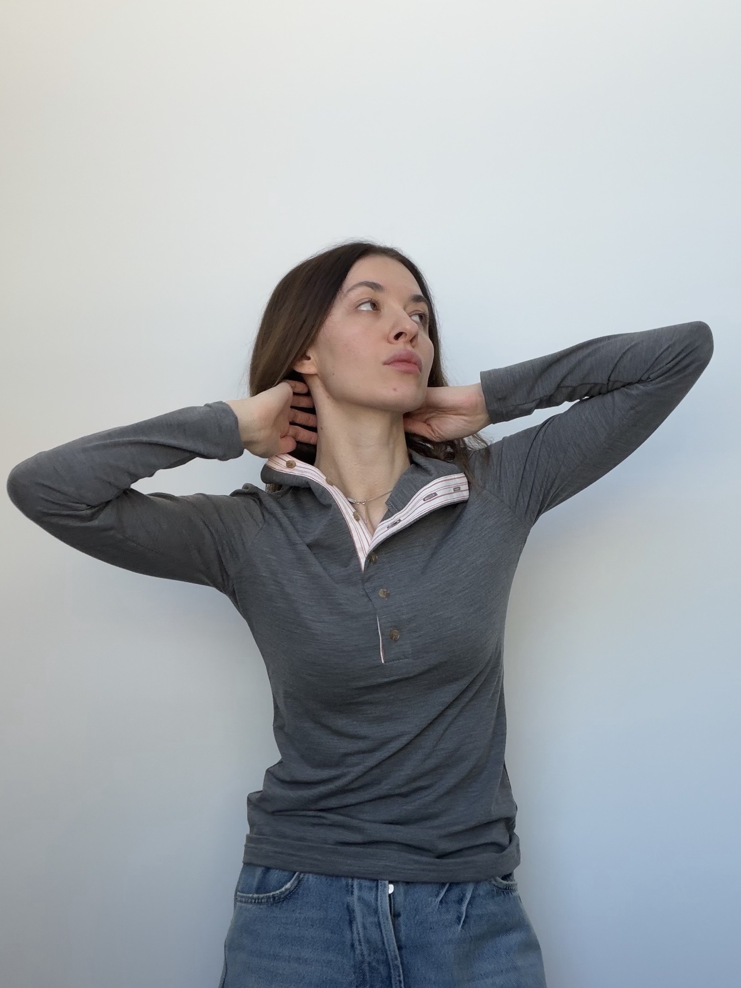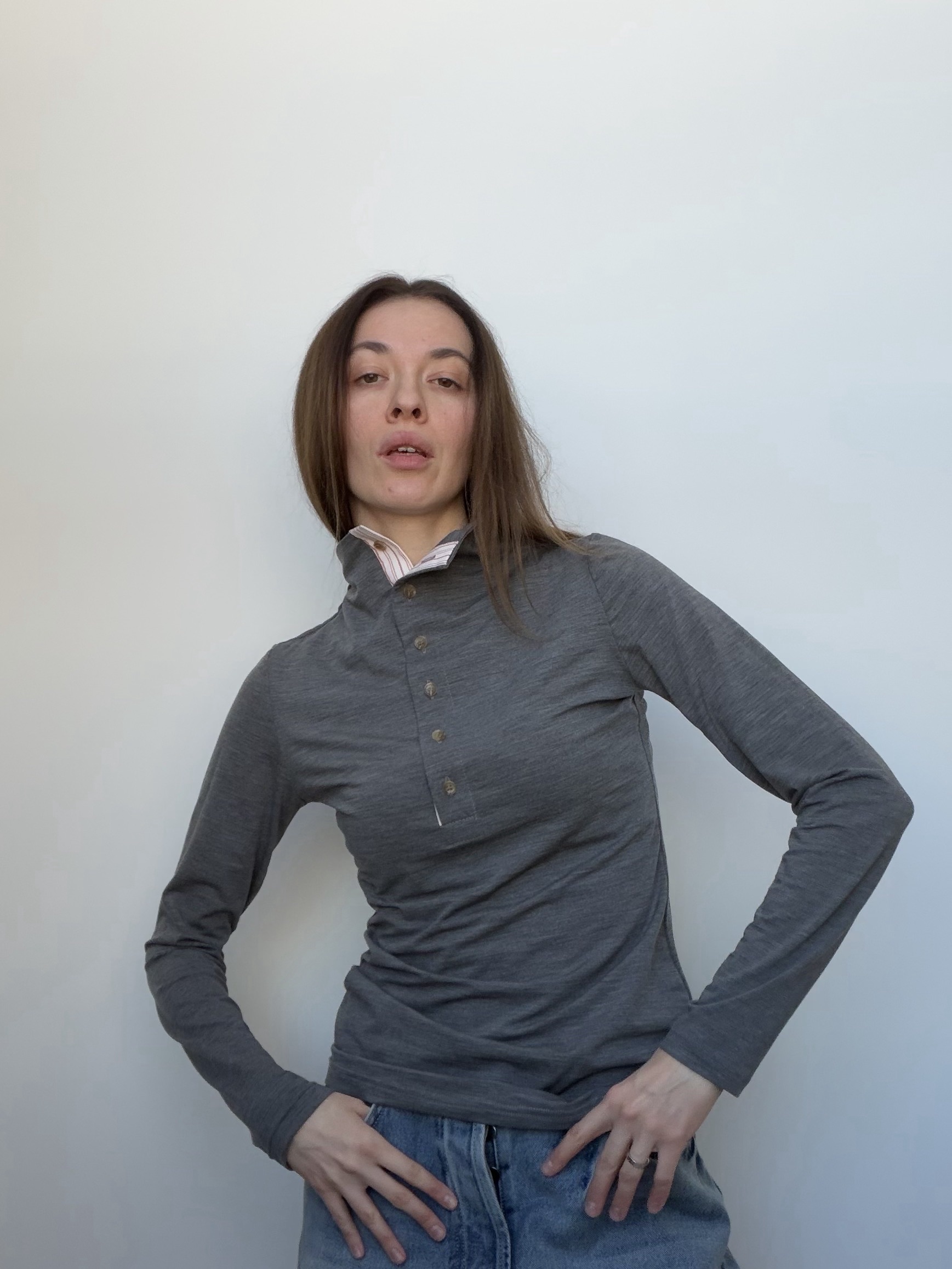Высокая горловина на пуговичках обработана контрастным хлопком