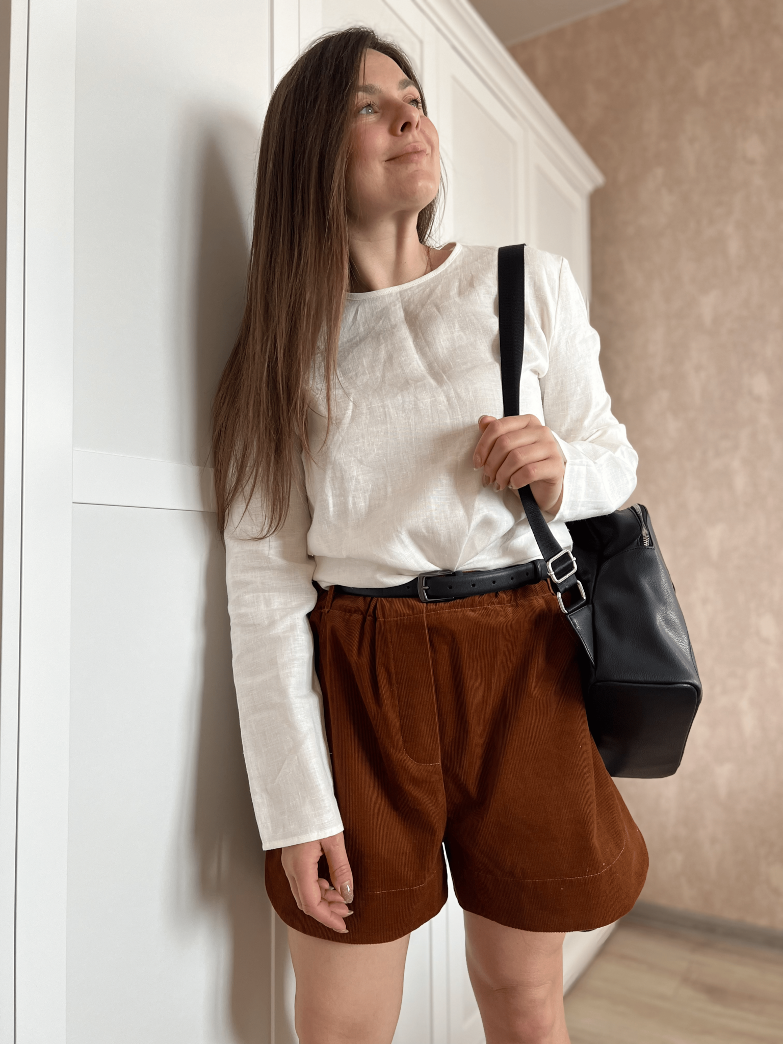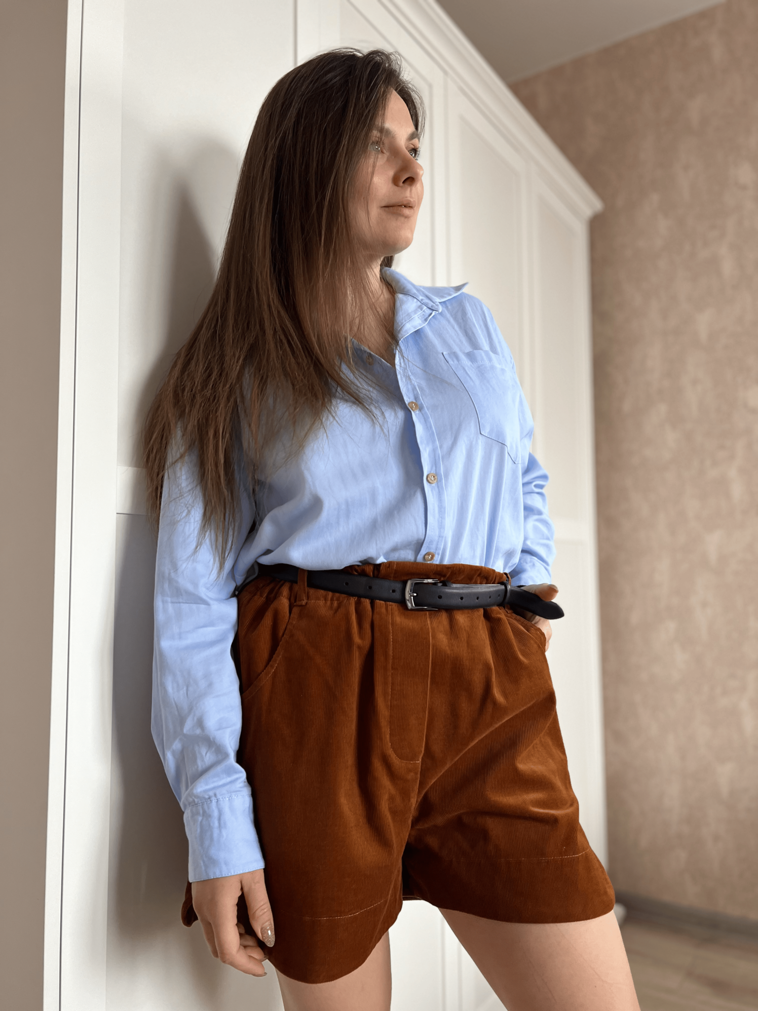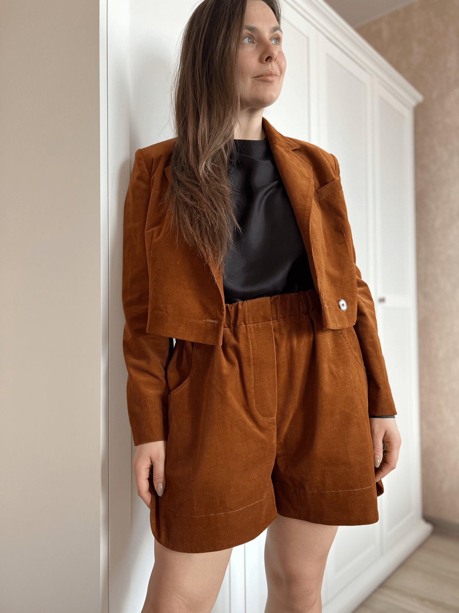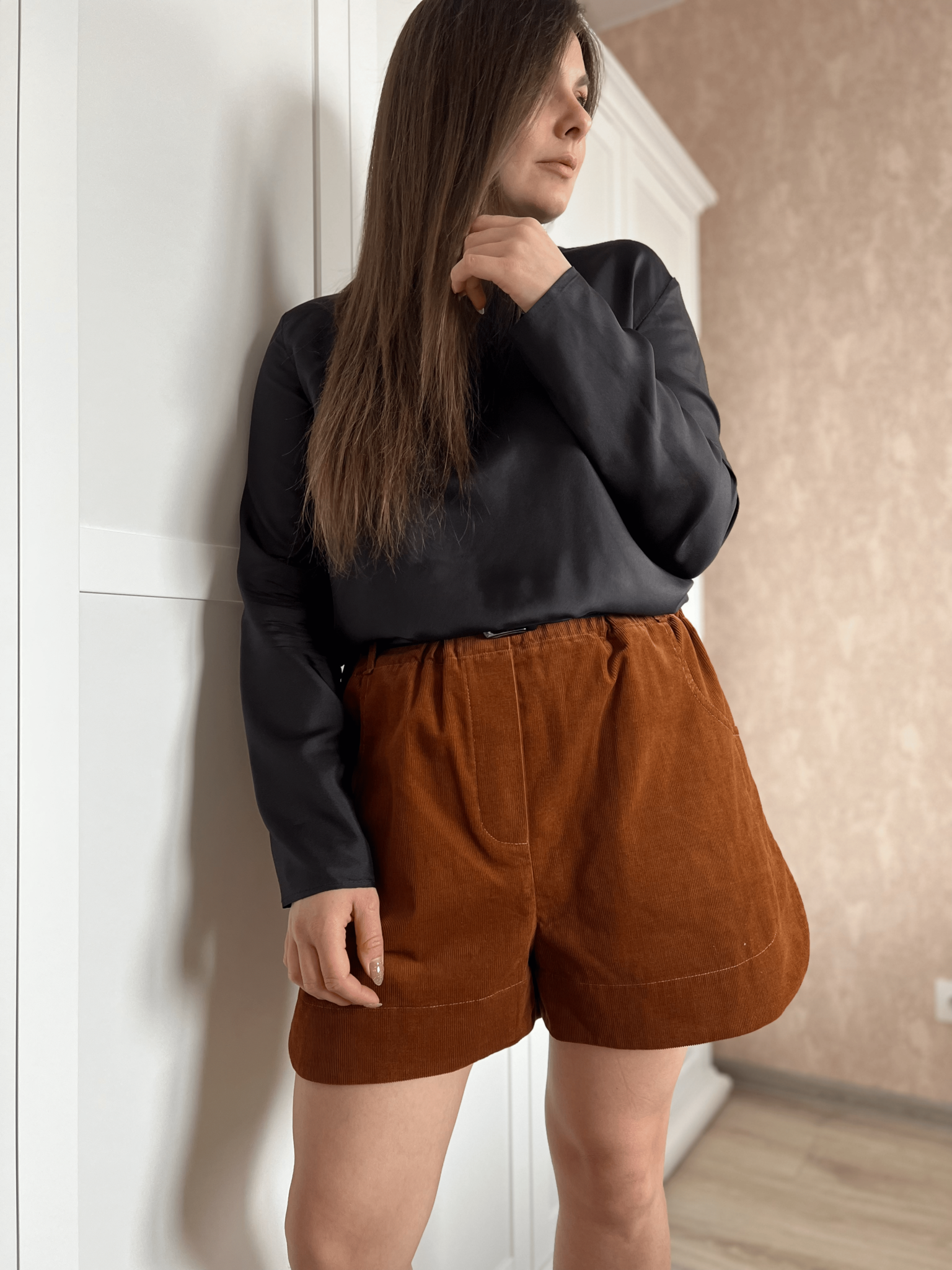 Шорты из коллекции Табак выполнены из нежного вельветона. Пояс на резинке, есть шлевки для ремня.